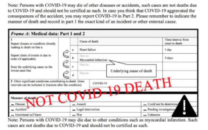 Según establecen las pautas de la Organización Mundial de la Salud (OMS), tales muertes no deben ser registradas como muertes a causa del coronavirus: «Las personas con covid-19 pueden morir por otras enfermedades o accidentes; estos casos no son muertes por covid-19 y no deben ser certificados como tales«.