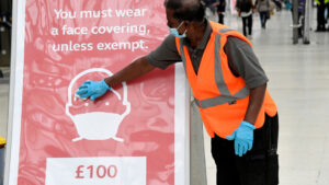 Un trabajador con una mascarilla limpia un letrero en la estación de tren de Waterloo en Londres, Gran Bretaña, el 7 de septiembre de 2020. Toby Melville / Reuters