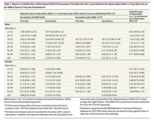 La tasa de miocarditis en hombres entre 18 y 24 años fue de 52,4 casos por millón de inyecciones de Pfizer y 56,3 por millón de dosis de Moderna. La tasa de fondo fue de solo 1,76 por millón de dosis.